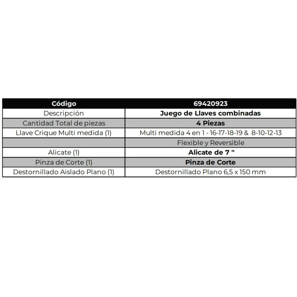 Set de Llaves Multi Medida + Alicate y Destornillador (4 Pzas)